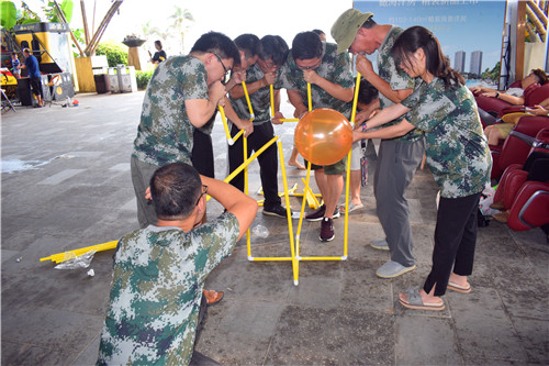 我们人数不多但士气高昂,首先我们先换上迷彩T恤衫,每个人都精神抖擞,先进行破冰热身活动快速让我们团队融入到活动当中。我们分组分队选队长安全员起队名和口号摆出创意造型。印象最深刻的就是动感颠鼓活动,我们每个人在团队中都很重要缺一不可,每人手里拉的绳子就像我们自己的岗位一样。鼓面像公司平台,球就像我们工作的目标和我们要完成的业绩。